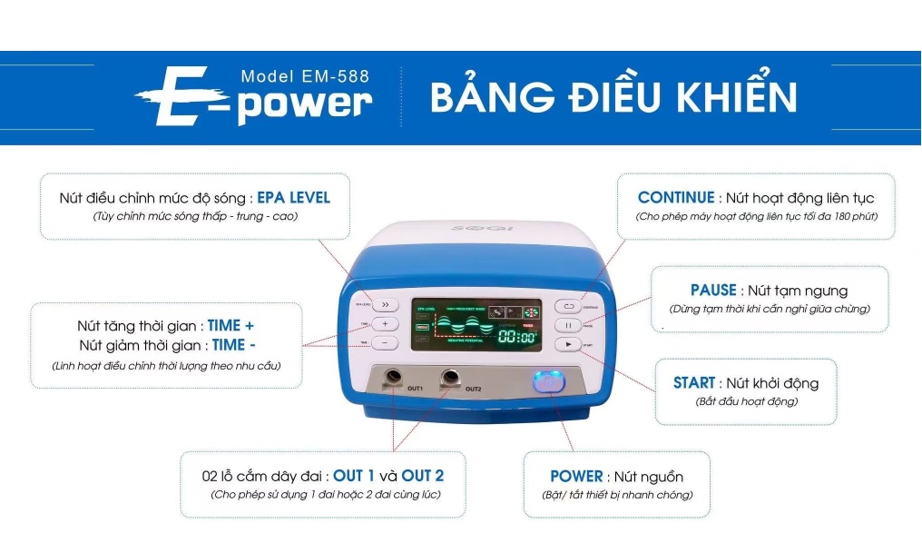 Ấn nút mở/tắt nguồn, đèn ở nút nguồn và màn hình Led đồng loạt sáng đèn, sau khi máy phát 3 tiếng “bíp – bíp – bíp” tự kiểm xong sẽ trong trạng thái chờ cài đặt: các vị trí EPA LEVEL, HIGH FREQUENCY WAVE, NEGATIVE POTENTIAL và TRỤC 0-Y , ký hiệu mở nguồn trên màn hình hiển thị đều được sáng đèn, thời gian hiện thị 00:00.